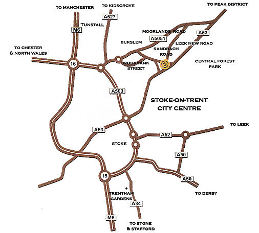 the M6 at junction 15/16 and take the A500 and then the A53,